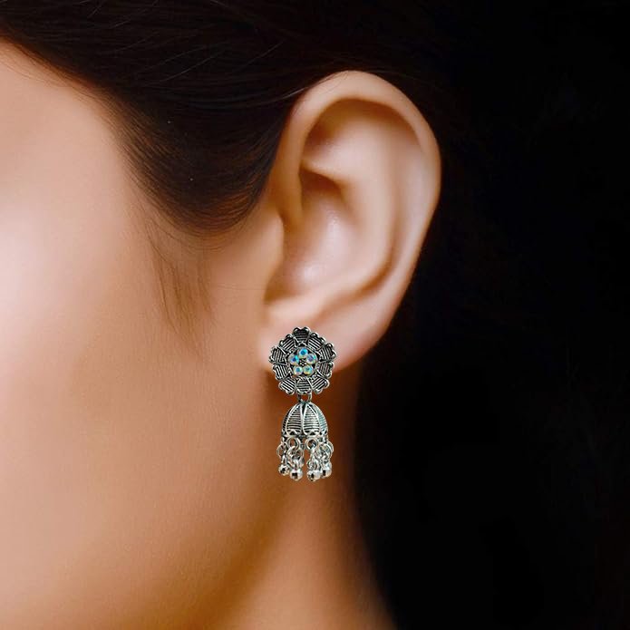 + Free Shipping- DESIGN: Beautiful oxidised silver jhumka earrings featuring an intricate crystal flower top design with detailed line patterns
