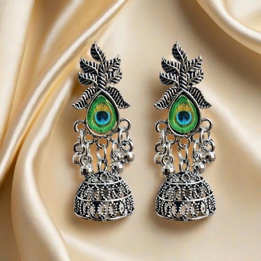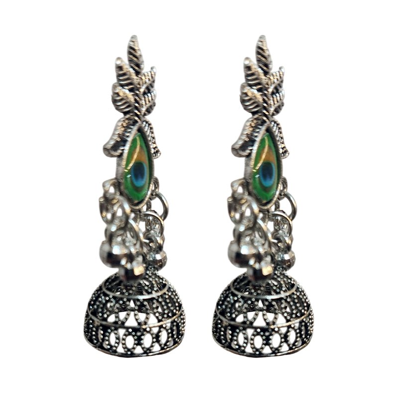 - DESIGN: Beautiful oxidised silver jhumka earrings featuring an intricate stunning peacock feather oxidized detailed line patterns
